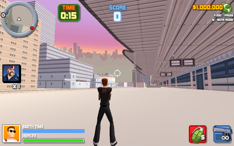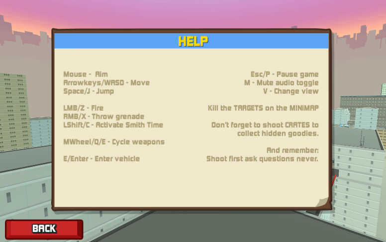 How to play Agent 77: 1. Use Mouse to aim; 2. Use arrow keys and WASD to move; 3. Use Space or J to jump; 4. Use LMB/Z to fire; 5. Use RMB/X to throw grenade; 6. LShift/C to reactive smith time; 7. MWheel/Q/E to circle weapons; 8. E/Enter to enter vehicles. 9. ESC/P to pause the game; 10. M to mute audio; 11. V to change views.
