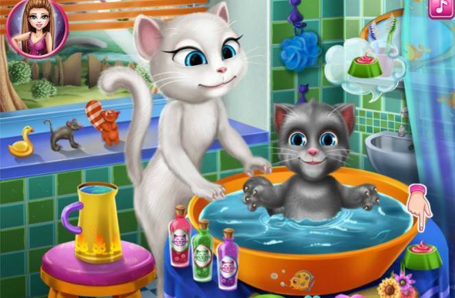 Angela's little kitten is in need of a bath and she wants your help! Prepare the bathtub with bubbles and beautiful flowers so that you can start washing the adorable kitty. Shampoo his hair, rinse all the soap away and use a cute toy to cheer him up. Go to the porch after you've finished bathing him, comb his fur and spend a lovely day with Angela and her precious kitten.