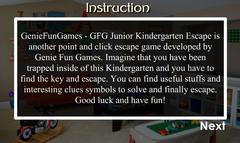 Gfg Junior Kindergarten Escape is an online game that you can play in modern browsers for free. Gfg Junior Kindergarten Escape Online is in the category of Skill. This game has received 9019 plays and 73% of game players have upvoted this game. Gfg Junior Kindergarten Escape is made with Flash technology, and it's available on only PC web. You can play the game free online on your Computer.