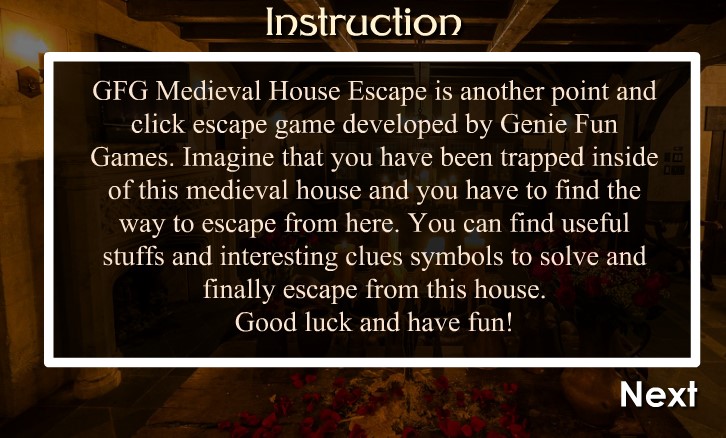 GFG Medieval House Escape is a kind of point and clicks escape game. Imagine that you have been trapped inside this medieval house and you have to find the way to escape from here. You can find useful stuffs and interesting clues symbols to solve and finally escape from this house. Click to play the game free online now! Have a good time~