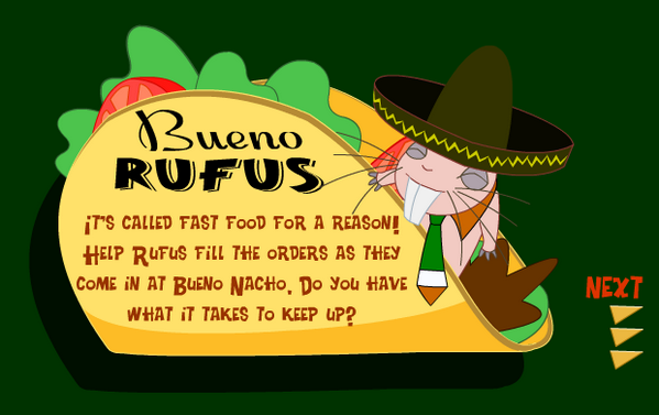 Its called fast food for a reason! Help Rufus fill the orders as they come in at Bueno Nacho. Do you have what it takes to keep up? Help Rufus fill the orders!!! Fill the fast food orders correctly by putting the appropriate toppings on the food. Click to play the game free online now! Have a goog time~