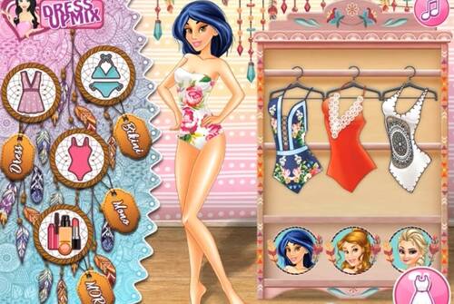 Princesses Elsa, Belle, and Jasmine are going to the beach for a cooler holiday. Can you help them dress up with beautiful swimsuits in Boho style? Have fun!
