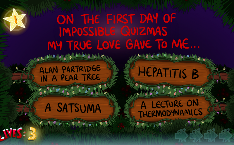 The Impossible Quizmas is a super fun Christmas-style quiz game. Your goal is to answer all these questions. You only have 3 chances to answer incorrectly, or you have to restart the game. Click to play the game free online now!